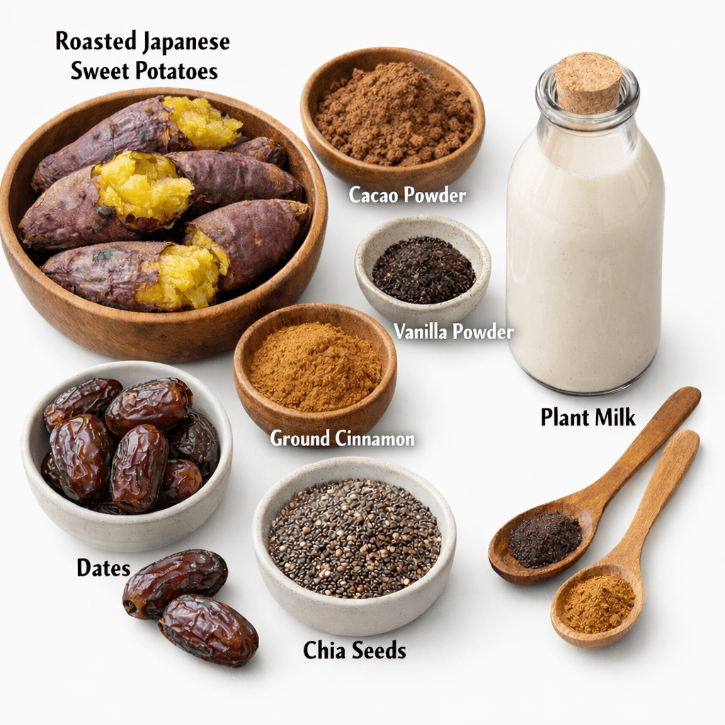 Cooked sweet potatoes create an unexpectedly creamy base, while chia seeds add body along with fiber, omega-3 fatty acids, and plant protein. Dates provide gentle sweetness, and cacao powder brings rich chocolate flavor without refined sugar. Everything blends into a silky, spoon-able pudding that feels indulgent but fuels the body.