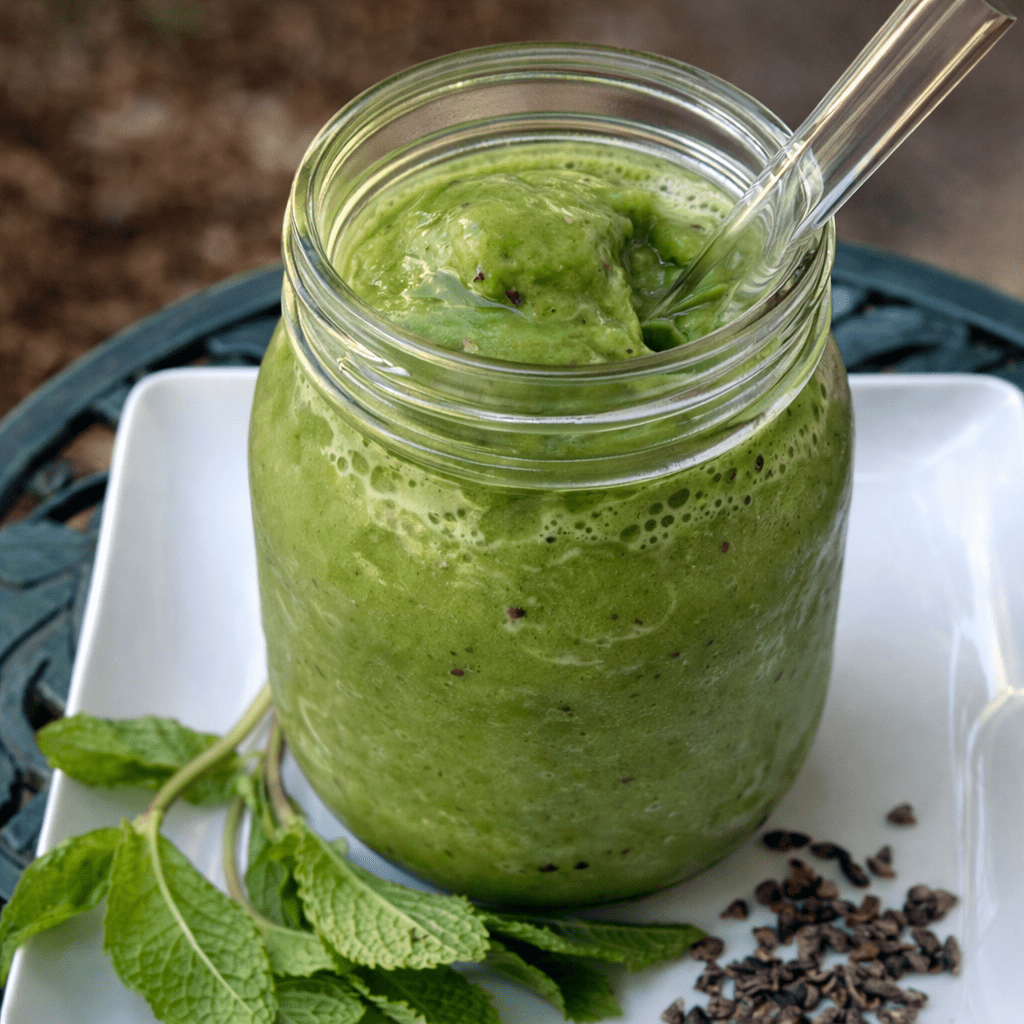 - Place everything (except the cacao nibs or chocolate chips) in the blender and process until smooth and creamy. Taste and add more mint leaves, sweetener and ice if desired. Add in the cacao nibs and process for just seconds to break them up enough that they will fit through the straw but not totally blend them up so you can still see little flecks of nibs through out the smoothie.
