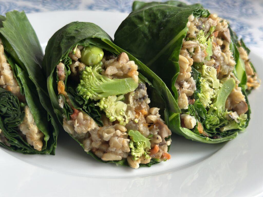 The risotto is delicious when used for wraps. Shown here are collard greens that I microwaved for 30 seconds to soften. Trim the stem, stuff and roll up. I added steamed broccoli and edamame. Cooked sweet potato is also scrumptious on top of the risotto, add a drizzle of balsamic vinegar for the final touch.
