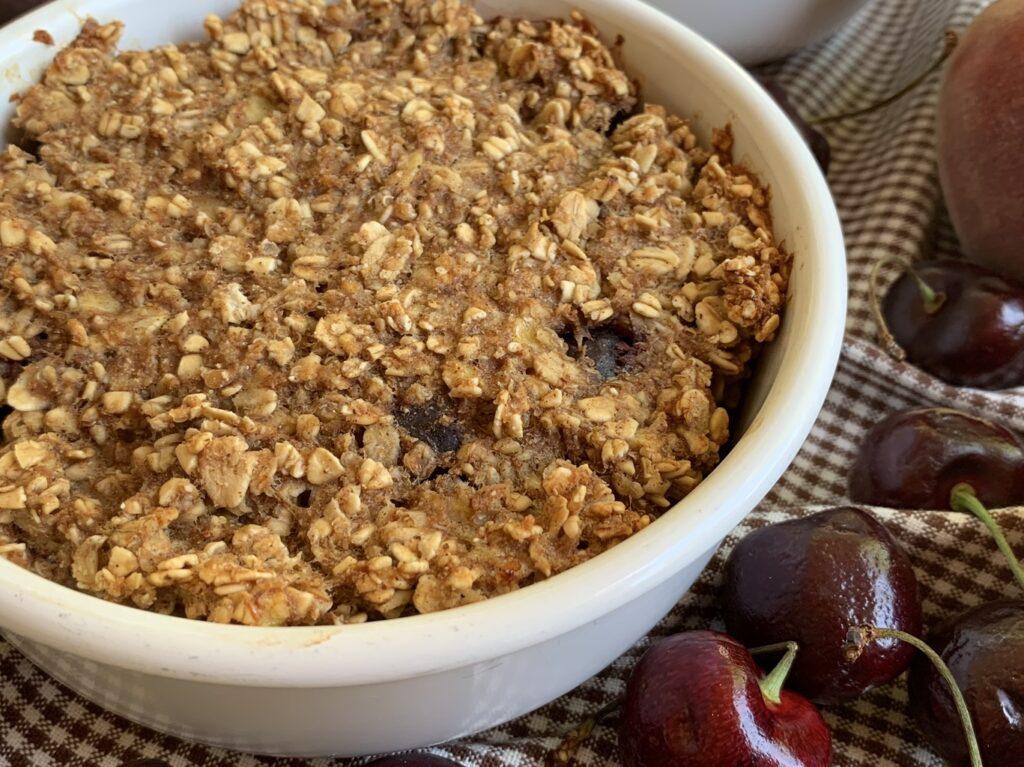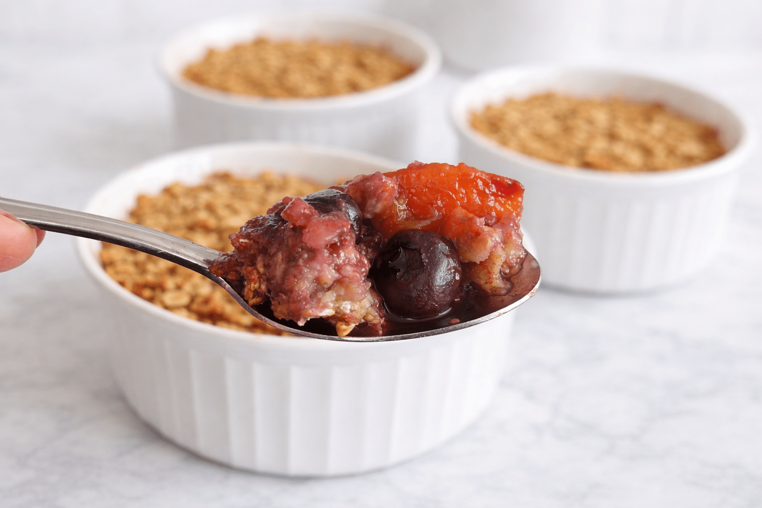 The fruit crisp is naturally sweet, hearty, and satisfying without relying on traditional butter, sugar or flour. The bananas act as both a sweetener and a binder, while the oats create a soft, lightly crisp topping that complements the juicy fruit underneath.