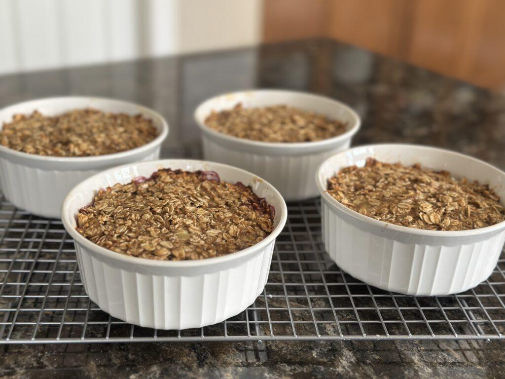 - Place fruit in 4 baking dishes that have a 2 cup capacity or use an 8 inch baking dish. The baking dishes should be about 2/3 full with fruit